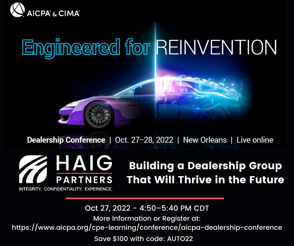 Alan Haig will be presenting "Building a Dealership Group That Will Thrive in the Future" at the 2022 AICPA & CIMA Dealership Conference. Learn more or register at https://www.aicpa.org.