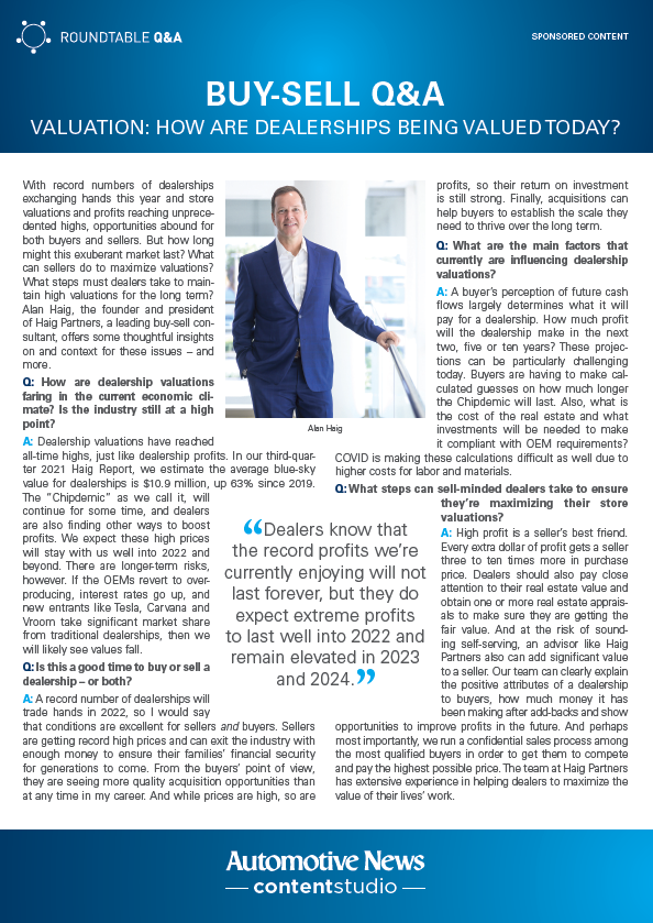 In this edition of the Automotive News Buy-Sell Expert Q&A, Alan Haig answers questions about how dealerships are being valued today: