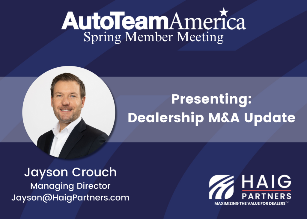 Haig Partners is a proud member of AutoTeam America and is looking forward to presenting an update on dealership M&A activity, trends impacting dealership values, and what we expect to see over the course of 2024 in regards to dealership buy-sell activity.