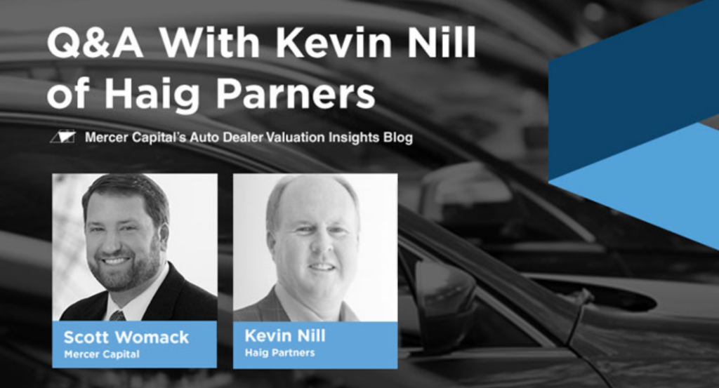 Scott Womack with Mercer Capital sat down with Kevin Nill here at Haig Partners to discuss trends in the auto dealer industry. In this Mercer Capital Q&A, Haig Partners talked about the unique conditions impacting auto retail and the changing methodology buyers are utilizing to assess dealership values. Read the full Q&A on MercerCapital.com.