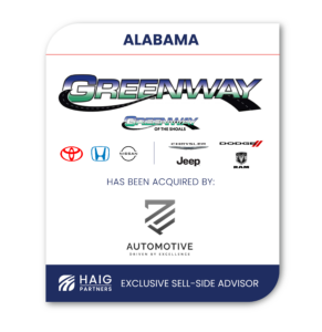 Haig Partners was honored to advise dealer principal Carl Atkinson on the sale of Greenway Automotive's Greenway of the Shoals dealership platform located in Alabama. Greenway Automotive ranks #20 on...