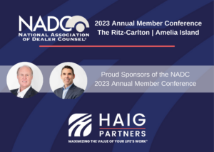 Haig Partners is proud to continue to support the National Association of Dealer Counsel through sponsorship and participation. Kevin Nill and Mike Toth will be attending the 2023 Annual Conference...
