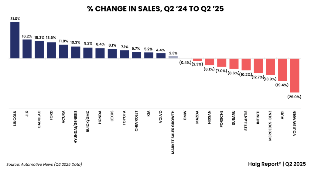 The Q2 2025 Haig Report® shows that U.S. new vehicle sales grew a modest 2.3% year-over-year, but the gains were far from evenly distributed. While some franchises surged ahead, others stumbled under the weight of tariffs, shifting consumer preferences, and product challenges.