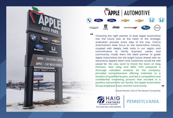 Haig Partners Facilitates Landmark Sale of Apple Automotive Group's 10 Dealerships to Ciocca Automotive