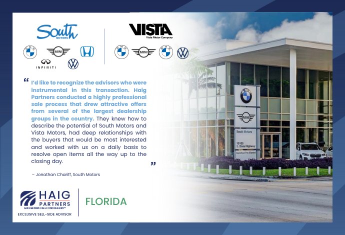 Haig Partners Advises on Record-Setting Sale of South Motors/Vista Motors in South Florida - 9 Dealerships and 2 Collision Centers