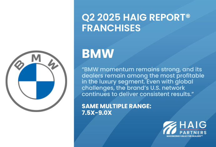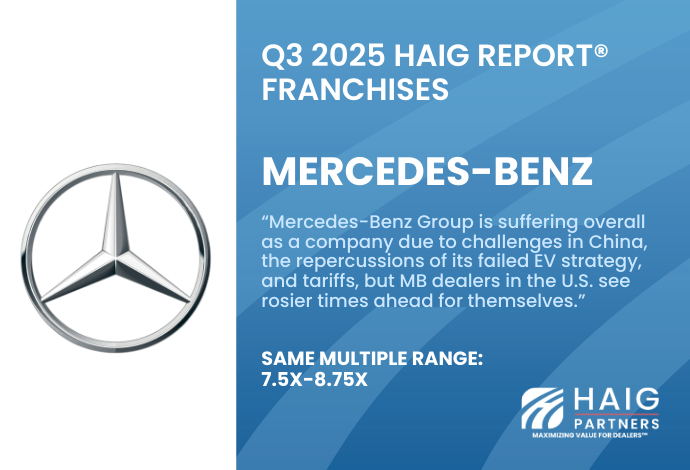 Haig Partners has advised on the sale of more Mercedes-Benz dealerships than any other firm, and we continue to track how multiples and market conditions evolve quarter by quarter. As the only M&A advisory firm to publish franchise multiples consistently for over a decade, we give our clients unmatched insight into what buyers are really willing to pay.