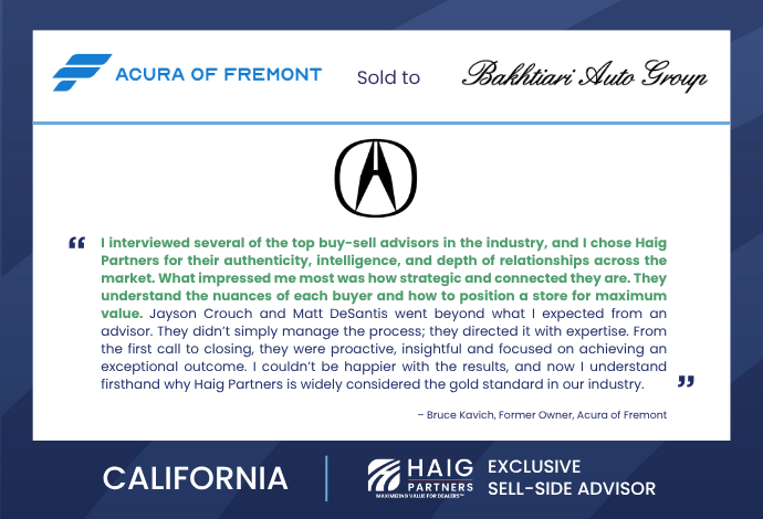 A Strategic Sale in California’s Strong Market: Haig Partners Advises Bruce Kavich in the Sale of Acura of Fremont